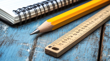 A vibrant close-up view of a yellow pencil, wooden ruler, and spiral notebook arranged on a rustic wooden surface, perfect for showcasing educational themes.