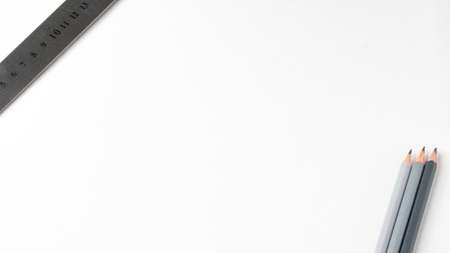 Metal ruler and simple pencils grey under metal on a white background space for inscription