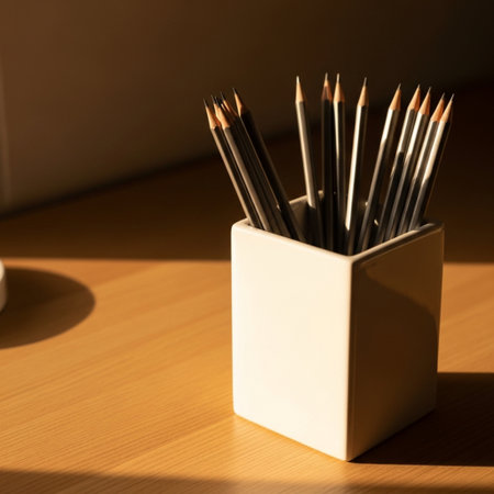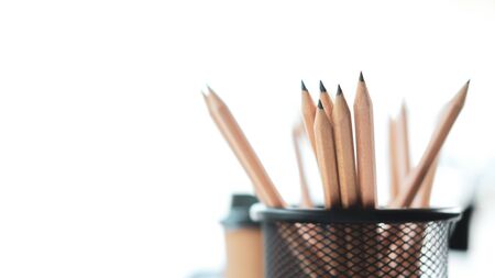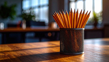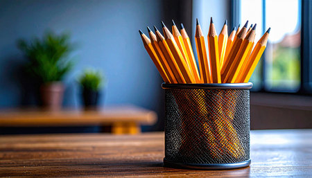 Closeup of sharpened yellow pencils standing upright in a metallic mesh pencil holder, placed on wooden desk with natural daylight, minimal school supplies concept