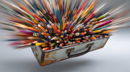 A collection of vibrant colored pencils is exploding out of a vintage metal case, showing creativity and artistic potential in a striking arrangement.