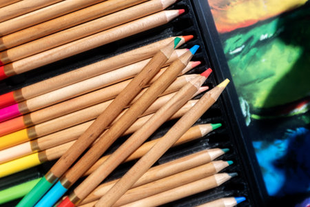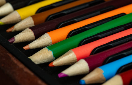 Close-up of multi colored pencils or wooden crayons to each other arranged in a neat row in wooden pencil case. The arrangement of the colors pencils creates a sense of unity. Pencils made of natural eco-friendly materials safe for children, Stationery for drawing and creativity, use it as your Wallpaper, Poster, Design and Space for text, Selected focus.