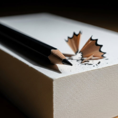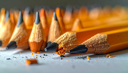 A close-up photo of a sharpened black pencil resting on a dark surface, surrounded by shavings and dust, highlighting the art of creativity and precision in writing.