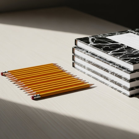 A close-up view of a neat row of pencils of different colors lined up on a desk.