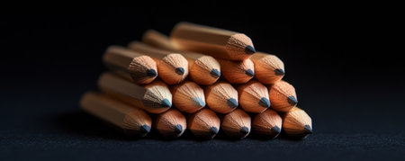 Stack of sharpened pencils in pyramid on black background, artistic arrangement. Creativity and art supplies concept