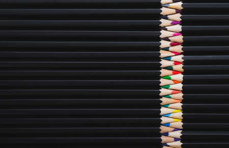 Creative minimal background. Black Colored pencil set arranged tightly to each other, copy space.