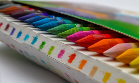 A neat arrangement of colored pencils on a clean white background, with vibrant hues displayed in perfect harmony, ideal for creative projects