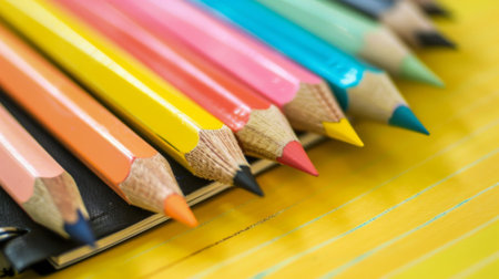 A collection of vibrant colored pencils neatly arranged in a row on top of a bright yellow table. The pencils are sharpened and ready for use, creating a visually appealing display.