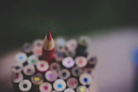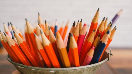 Colored pencils background. Close up various colors of old in used colored pencils on glass table in art studio, vintage tone style. Artist tools for making artworks.