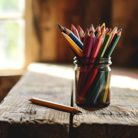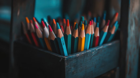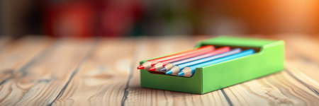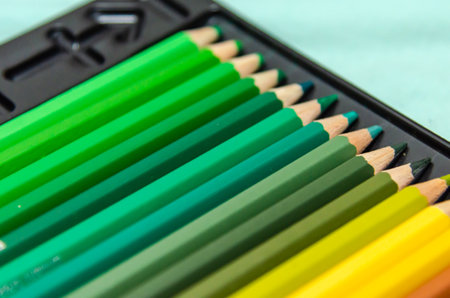 Colorful colored pencils arranged in a green box on a wooden table background during daylight