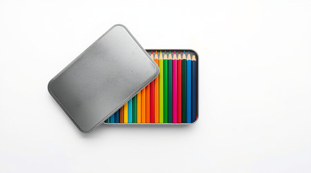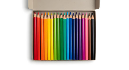An open cardboard box of 24 sharpened colored pencils, arranged neatly in a rainbow spectrum. The box is shown from a top-down view, isolated on a white background, perfect for art, school, or creativity concepts.