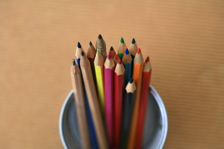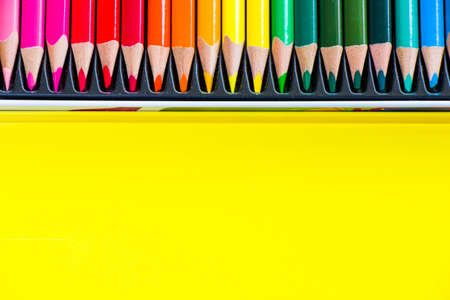 Multicolored and colorful pencils on the yellow background, stationary thing for drawing and paint