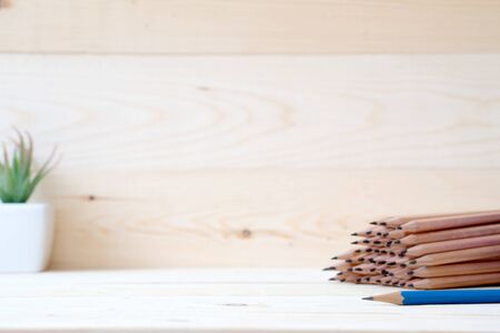 Colored pencils and pastels for drawing. They lie on pine boards. Top view Close-up.