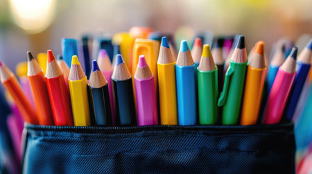 Detailed shot of a pencil case filled with an assortment of colored pens and markers, with a soft, blurred background