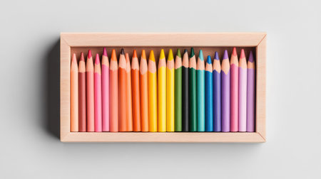 A visually appealing wooden box showcases a vibrant collection of colored pencils arranged in a smooth gradient, perfect for artistic endeavors.