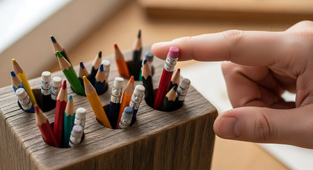 a hand reaches for a pencil with an eraser in a wooden holder filled with short colored pencils