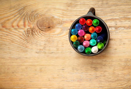 Still life, business, education concept. Crayons in a mug on a wooden table. Selective focus, top view, copy space background