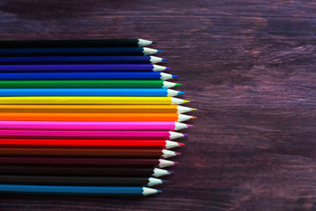 Row of colorful pencils rainbow order on wooden table