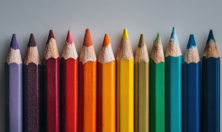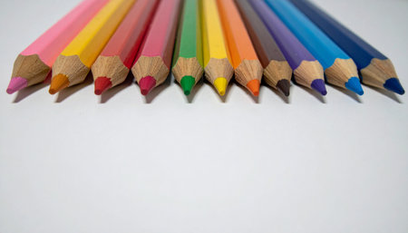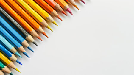 A vibrant collection of colored pencils lies ready on a clean white surface, their sharpened tips promising a world of creativity.
