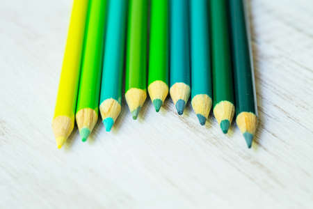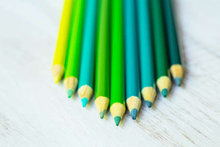 Blue and green colored pencils in a row on white background