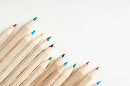 Colored pencils on the left on white background arranged obliquely