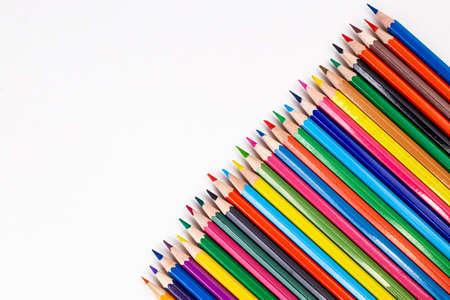 Multi-colored pencils on a white background with copy, space
