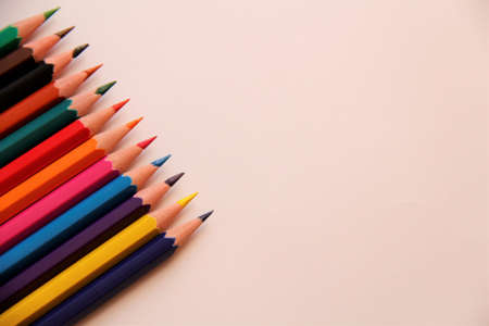 Colored pencils on neutral background . Close-up, copy-space for text.
