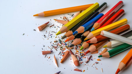 A vibrant assortment of colored pencil crayons scattered with shavings on a clean, white surface, perfect for creative projects or artistic inspiration.