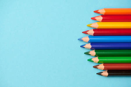 a row of colored pencils with different colors against light blue background, pencils on the right side with copy space
