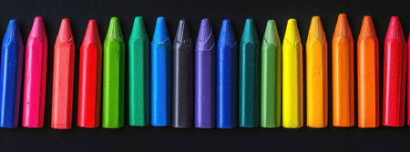 Colorful assortment of crayons arranged in a neat row on a black background, showcasing vibrant hues ideal for creativity and art projects.