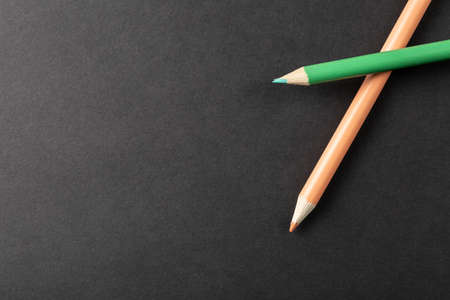 two colored pencils on a gray background top view. schoolboy search for desired color, set for drawing lesson. view from above