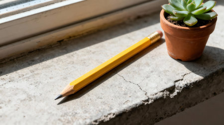Classic yellow number two pencil pointing toward a window frame, placed next to a healthy green succulent in a small reddish brown clay flowerpot, harshly lit by direct sun.