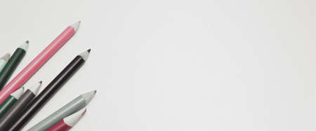 Colored colorful pencils on a light gray background. Photo banner. View from above. Place for text.