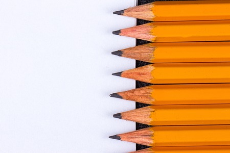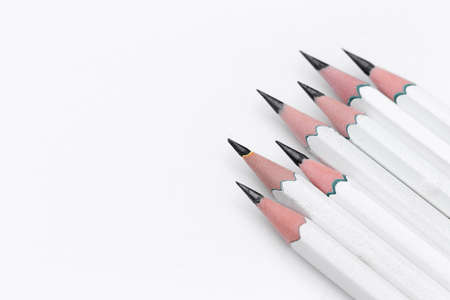 New and used pencils on white paper. Pencil with experience. Empty space for text