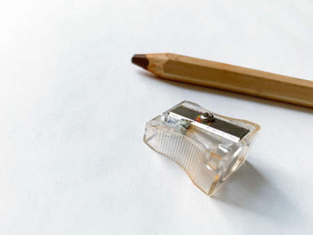 Sharpener and brown pencil on white paper background. Selective focus on sharpener.