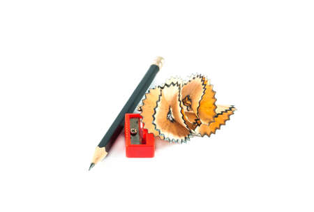 Pencil, metal sharpener and pencil shavings on white background. Horizontal image.