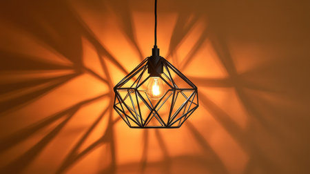This artistic pendant light features a modern geometric design, casting beautiful shadows on a warm orange wall, enhancing any stylish interior space.