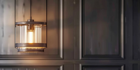 The image features a close-up of a decorative lamp with a textured glass shade and a warm, inviting glow. The lamp hangs from the ceiling in a dimly lit environment, showcasing a classic design. The background is blurred, suggesting an indoor setting with potential uses in interior design or lifestyle visuals.