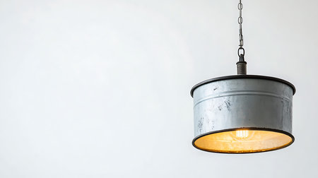 A warm vintage pendant light illuminates a minimalist workspace creating a cozy atmosphere for inspiration.