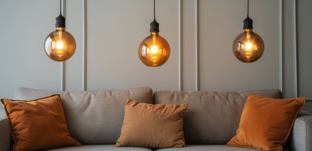 Ceiling lights hanging in a room, casting a warm and cozy glow. Concept Interior Lighting, Cozy Atmosphere, Room Decor, Hanging Lights, Ambient Glow