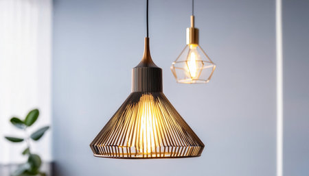 Two stylish pendant lamps hang in a contemporary room, showing innovative designs that combine form and function beautifully.