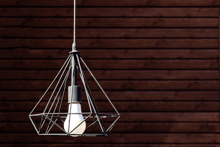 Close-up of modern pendant lamp hanging during on wooden wall background, copy space.
