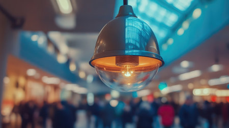 A stunning pendant light hangs gracefully, emitting a warm glow, with a soft focus on a blurred background of people, showcasing modern design elements.