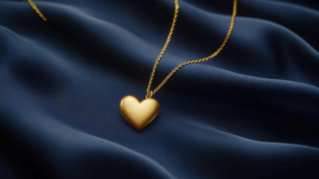 This image showcases a stunning golden heart necklace resting gracefully on silky blue fabric, capturing an essence of elegance and love. Perfect for jewelry lovers.