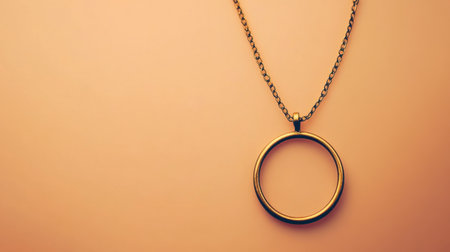 A top view of a pendant necklace with an intricate charm design, placed on a soft, textured background with plenty of space.