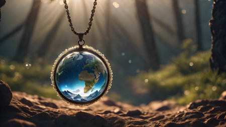 A close-up image of a hand holding a vibrant Earth globe pendant necklace amidst a lush green background, symbolizing connection to nature and the planet.
