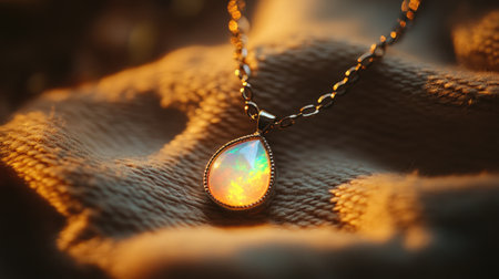This captivating image features a close-up of an opal pendant necklace with vibrant, colorful reflections. The pendant rests on a textured background, highlighting its charm and elegance.