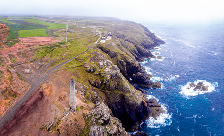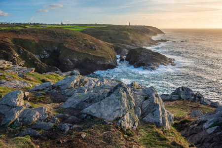 Beautiful sunset landscape image of Cornwall cliff coastline with tin mines in background viewed from Pendeen Lighthouse headland