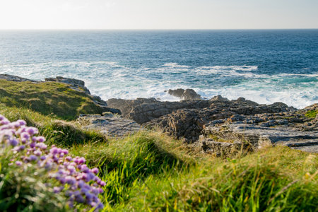 Rough and rocky shore at Malin Head, Ireland's northernmost point, Wild Atlantic Way, spectacular coastal route. Wonders of nature. Numerous Discovery Points. Co. Donegal