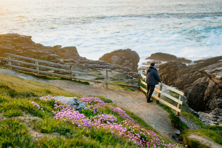 Tourist admiring scenic beauty of Malin Head, Ireland's northernmost point, Wild Atlantic Way, spectacular coastal route. Wonders of nature. Numerous Discovery Points. Co. Donegal