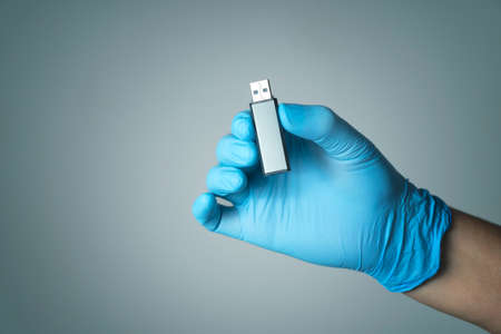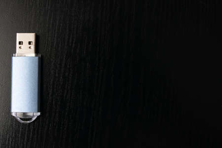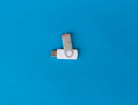 USB drive rests upon turn blue the glass table. Disk for keeping of information